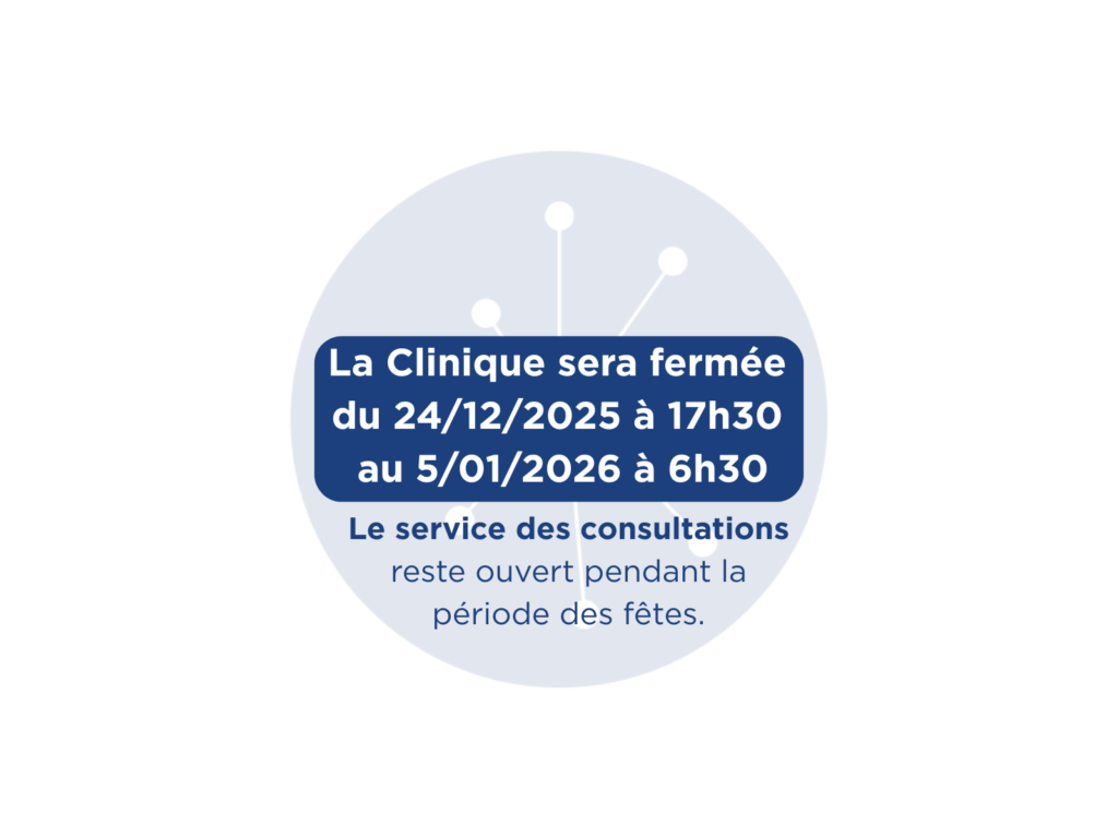 La Clinique ferme ses portes du 24/12/2025 au 5/01/2026. Le service des consultations reste ouvert pour recevoir les rendez-vous. Aucune urgence ne pouvant être assurée sur la période, nous vous invitons à contacter le 15.