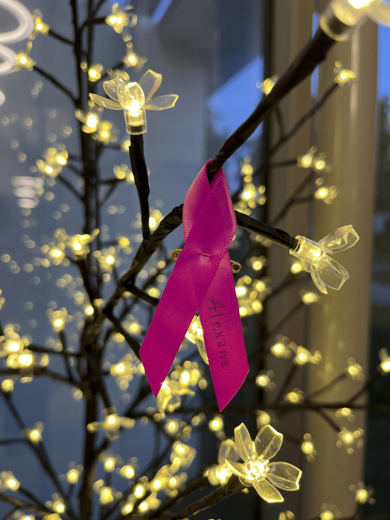Au cœur de cette installation, un cerisier japonais lumineux a trouvé sa place. Plus qu’un élément décoratif, cet arbre symbolise à la fois la vie, la douceur et le renouveau. Ses branches accueillent des dizaines de rubans roses, chacun portant le prénom d’un membre de notre équipe ou de patients ayant contribué par un don à La Ligue contre le cancer.